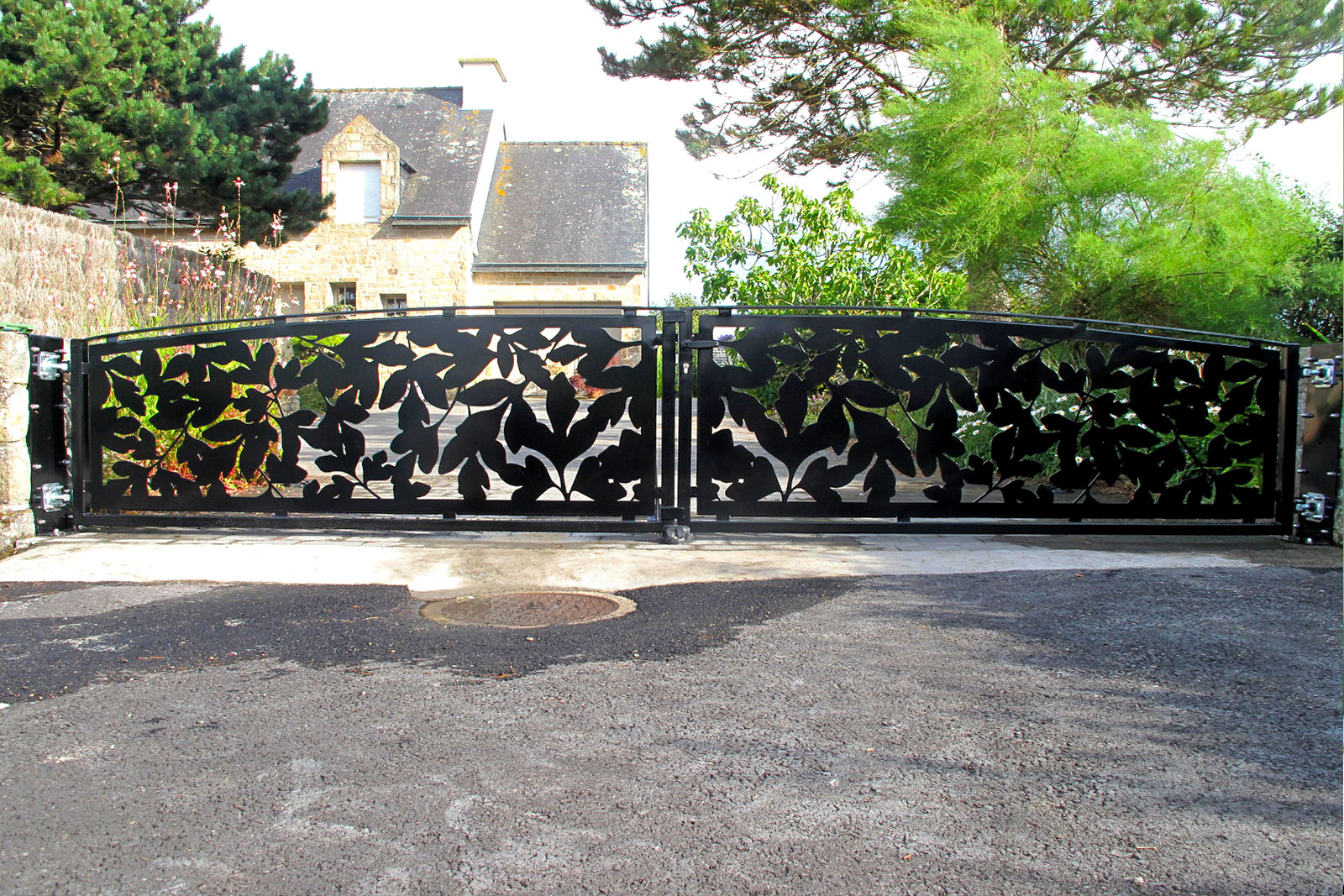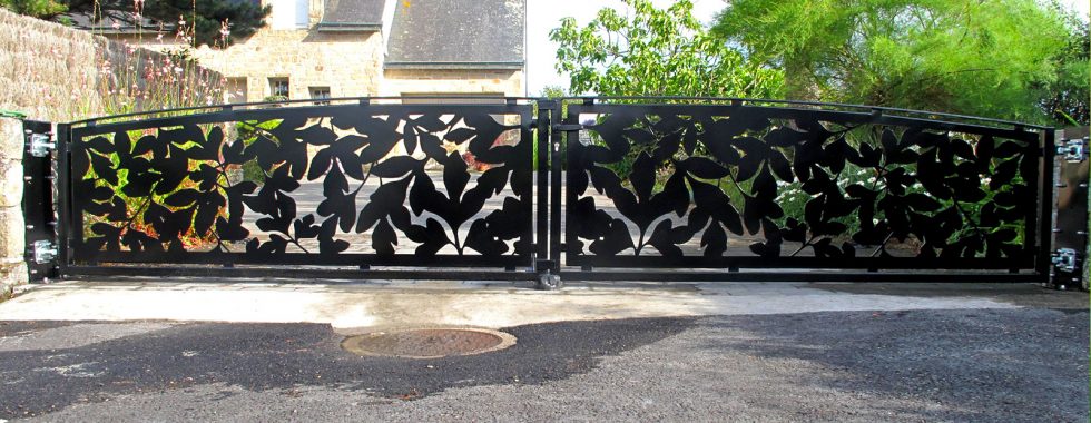 Portail 2 vantaux en acier .Motifs en forme de feuille réalisé en découpe laser. Finitions thermolaquage. Motifs réalisés par « néografix »