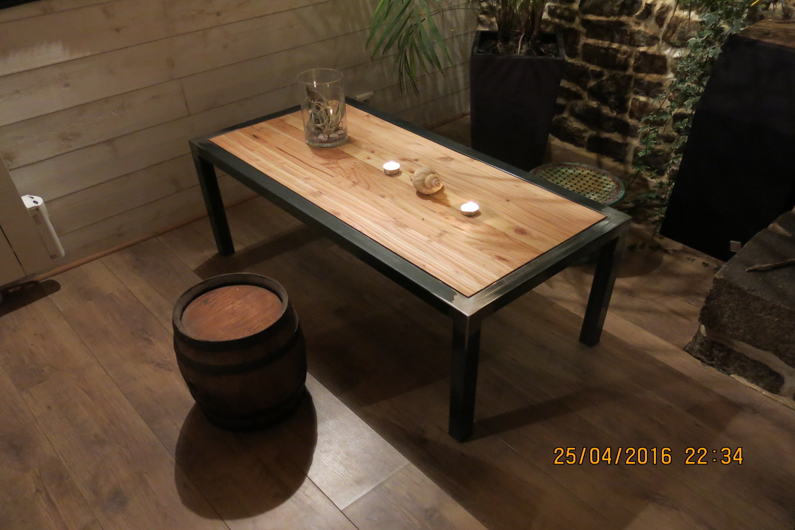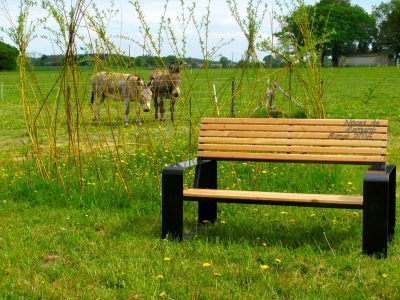 Banc en acier vernis pour une utilisation en extérieur avec une assise en douglas finition cire d’abeille. Pièce unique pour un cadeau de noces de...